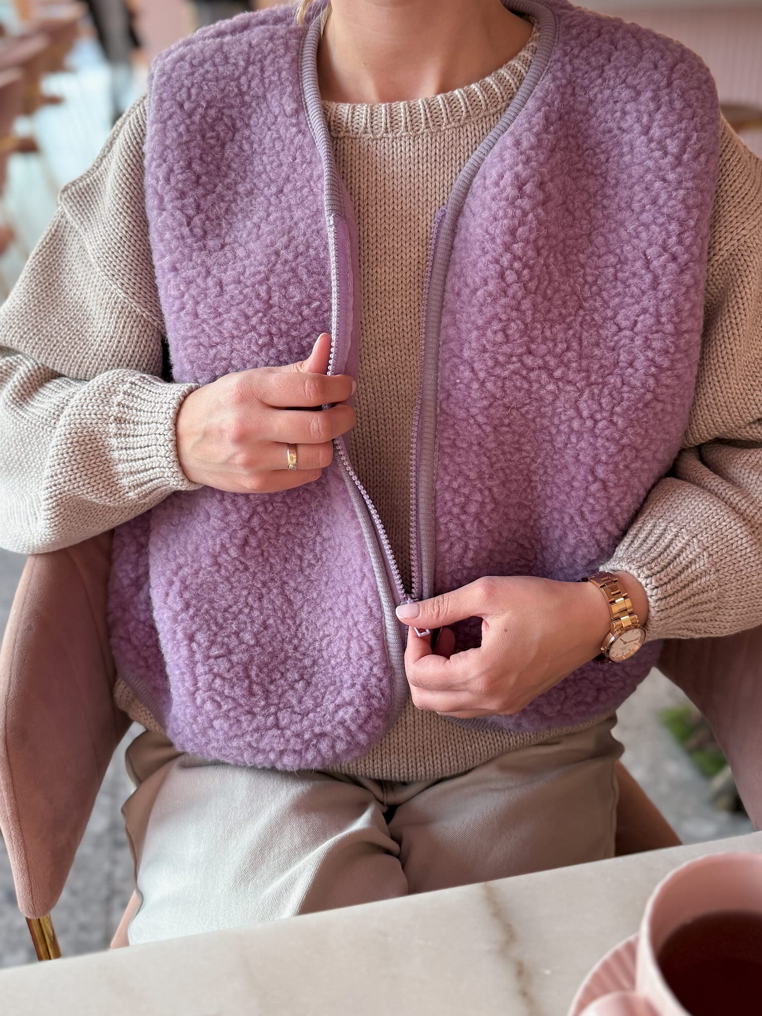 Kamizelka jest zapinana na suwak, co nadaje jej swobodny, luźny krój i pozwala na łatwe zakładanie oraz wygodne noszenie zarówno w domu, jak i na zewnątrz. Naturalna wełna merino doskonale reguluje temperaturę ciała – grzeje, gdy jest chłodno, i oddycha, gdy robi się cieplej.